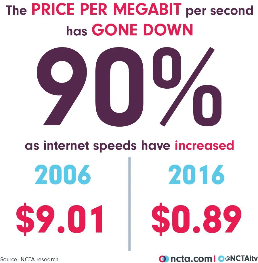 These are just a few examples and while remarkable, they shouldn’t come as a huge surprise. Cable companies have been expanding and improving their networks at an incredible clip for decades. In 1994, the fastest available home internet service available was 28.8 kbps via dial-up modem. Today, the top speed available is 2 Gbps. In just the last five years, top speeds have increased 7-fold. And for all this additional speed, Americans are paying less per megabit than ever before, down 90 percent since 2006.