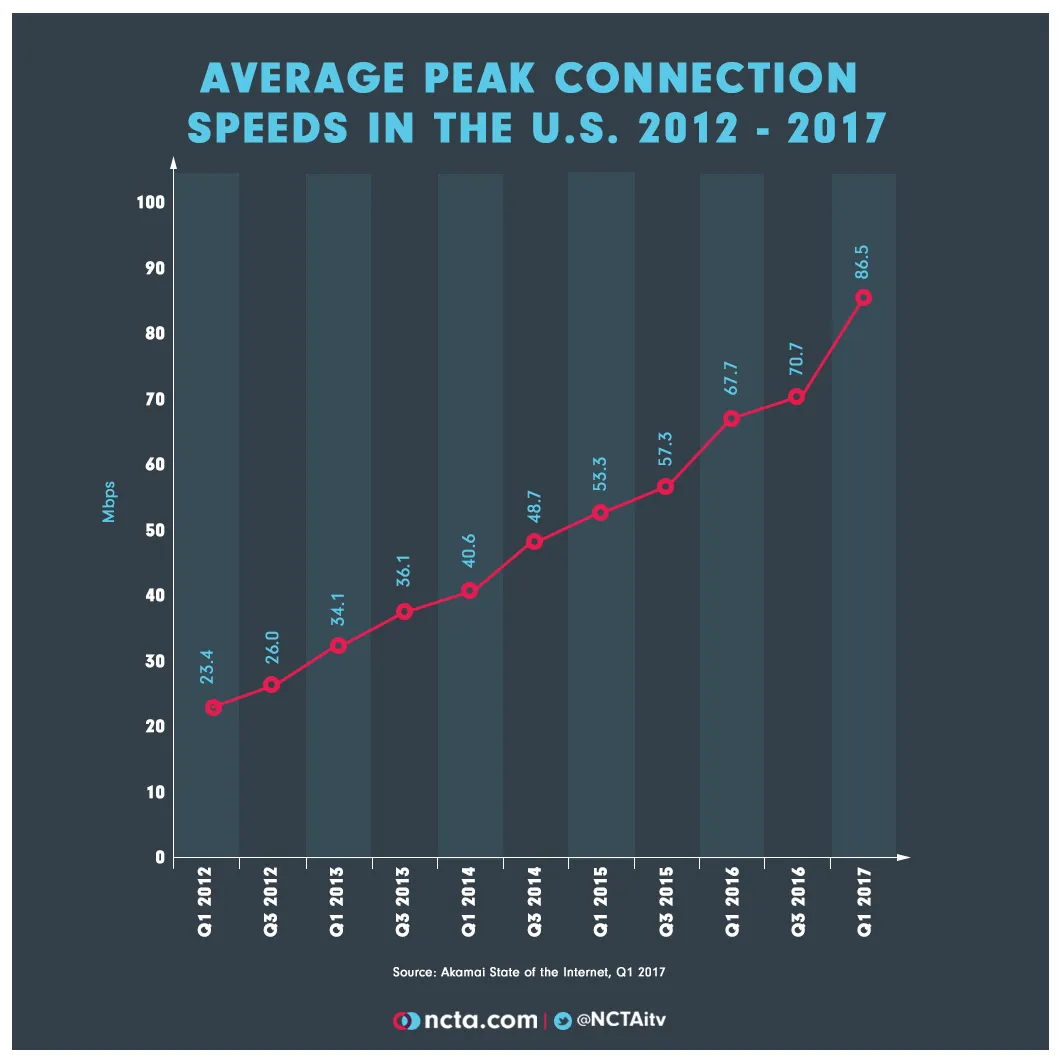 But these gains aren’t new or just limited to the last year. According to Akamai’s research, broadband speeds in America over the last five years have increased from an average peak connection speed of 23.4 Mbps to 86.5 Mbps.