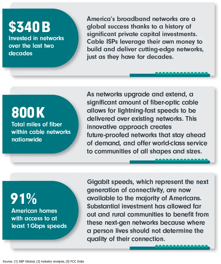 America has long led the world in advancing connectivity, from developing some of the first internet networks in the world to expanding service to communities ranging from dense urban centers to far out towns. America’s broadband success story is thanks to the decades of careful planning, substantial investment, and hard work of cable ISPs that deliver world-class broadband to the vast majority of Americans.