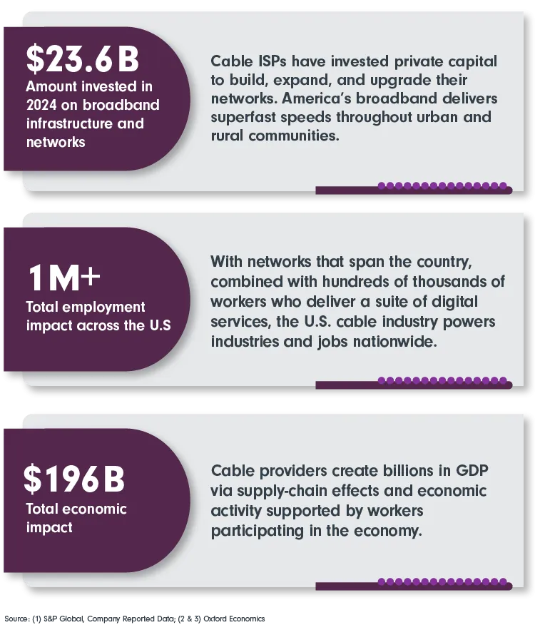 Through building, operating, and expanding powerful broadband networks coast to coast, cable ISPs are an important economic engine for the United States. Billions of dollars annually are invested to improve reliability, safety, speed, and capacity. America’s broadband leadership has allowed countless technologies and digital services to take off, powering American tech innovation and leadership.