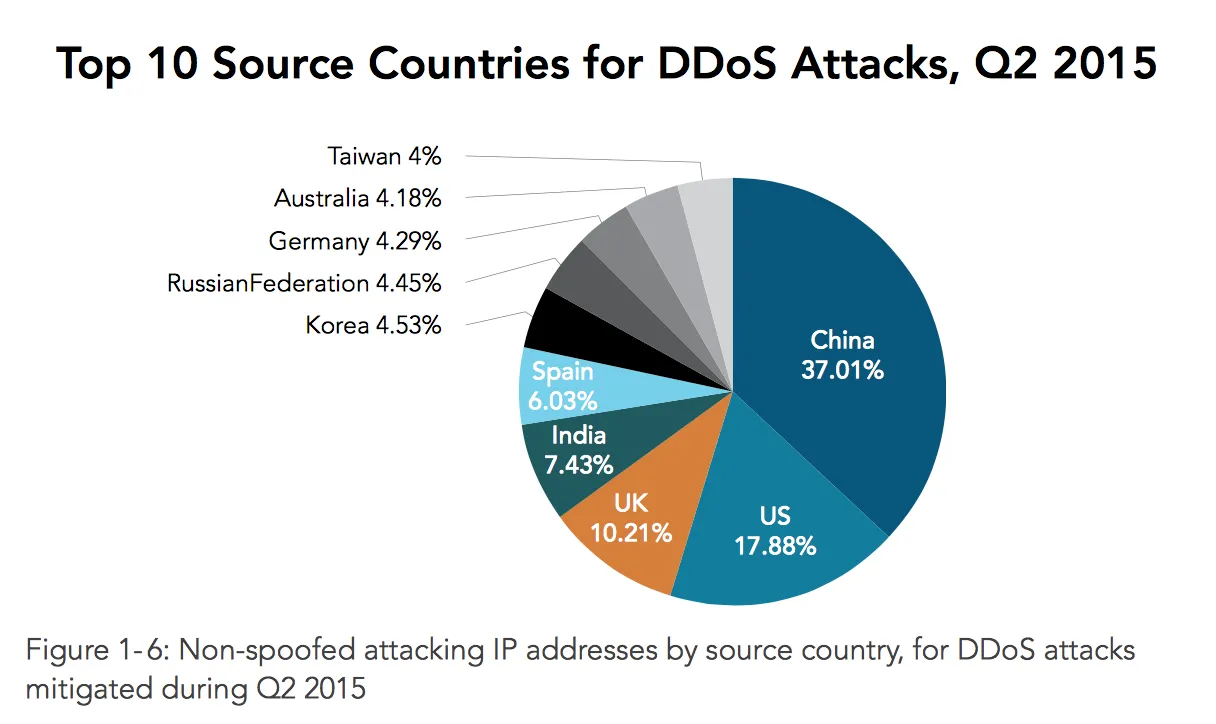 The chart below shows China at the top of the list for DDoS attack traffic, at 37 percent – up from 23 percent last quarter. Second and third were the U.S. and the U.K. According to the report, “all three countries showed significant growth in the number of attacks originating from within their borders.”