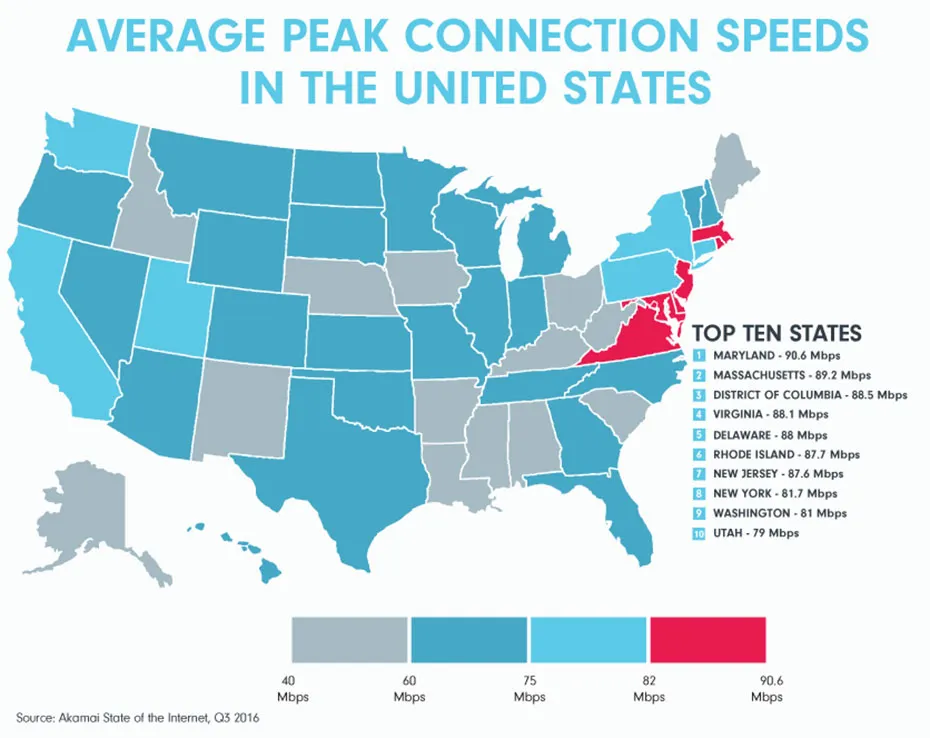 The quarterly report looked at several different areas of internet speeds and trends in data over time. When it came to ranking the states according to average peak connection speed, which measures the highest speed that an internet connection can support, Maryland took the crown at 90.6 Mbps. Maryland also enjoyed the greatest yearly growth in speed — at 24 percent — among the top 10 states with the highest average peak connection speeds.