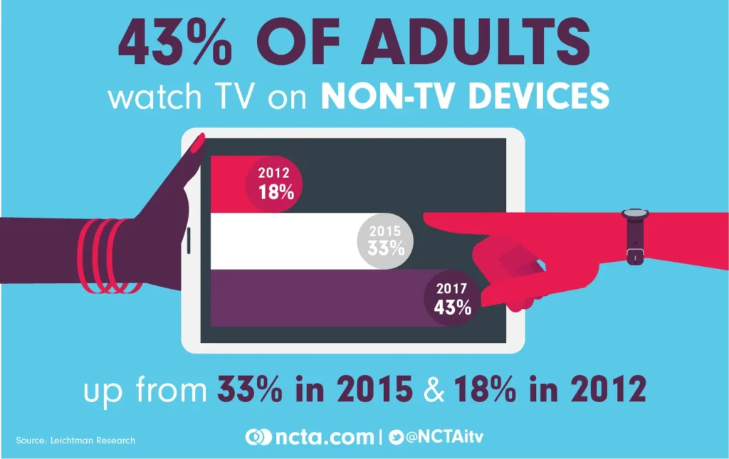 As more and more Americans are taking advantage of streaming video on demand services like Hulu or TV Everywhere apps, television as we know it is being redefined. A big part of that revolution is which screens we use to access these services. While television sets aren’t going away, they’re no longer the only place to watch our favorite shows. According to new data from Leichtman Research Group, 43 percent of adults watch tv on non-tv devices like tablets, laptops and phones. That’s up from 33 percent in 2015 and 18 percent back in 2012. As our lives grow more and more connected, we fit entertainment into our schedules instead of building our schedules around entertainment. Now more than ever, consumers are truly in control of their entertainment diets. For more information about the TV app revolution, check out our website.