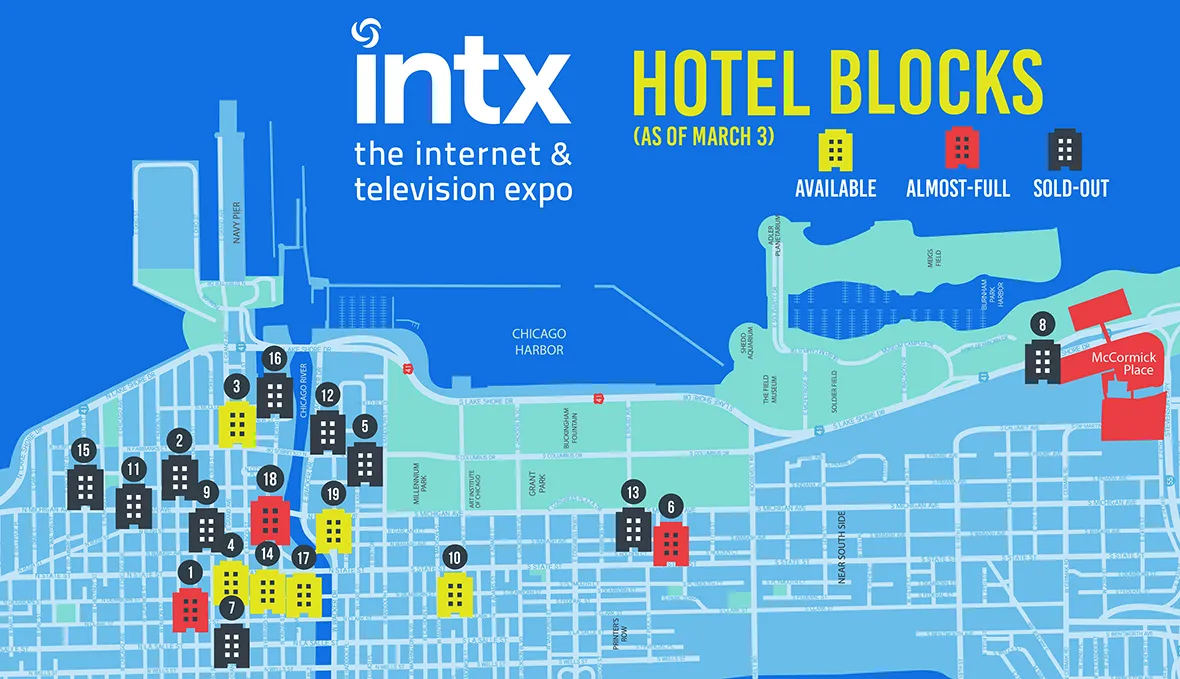 INTX hotels in downtown Chicago are filling up fast. Plus, if you reserve your hotel room in an official INTX hotel by April 3, you are automatically entered for a chance to win 100,000 travel points thanks to our “Book. Stay. Get Away.” promotion. Check out our infographic below to see exactly which hotels are still available.