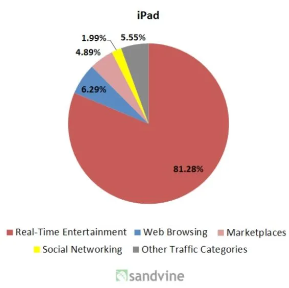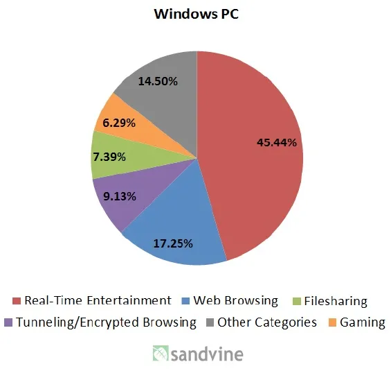 In Windows PC and Android it accounted for 45 percent and 62 percent of traffic, respectively, and an even greater share on iPad, where it took up 81 percent of traffic. It’s interesting to see that as a tablet screen gets larger, streaming consumption also goes up. A surprising finding came with Playstation 4, as Sandvine revealed that 65 percent of traffic went to video streaming, 25 percent to game purchases, free demos and software updates, and nearly 3 percent to game play. Set-top boxes and SmartTVs generated the largest share of real-time entertainment at 95 percent, as their primary function is to connect to a television and stream video.