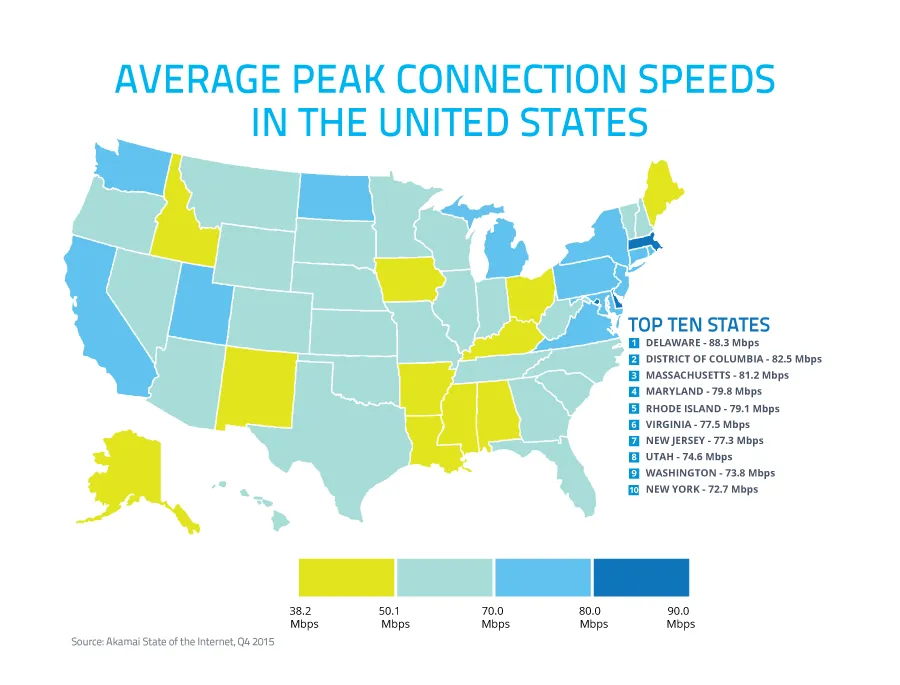 The results from the latest Akamai State of the Internet report are in and once again, 10 U.S. states rank among the top 20 fastest Internet territories around the globe. Delaware cracked the top five with an average peak speed of 88.3 Mbps, next to Singapore, Hong Kong, and South Korea. Akamai’s report from the last quarter of 2015 found that U.S. average connection speeds reached 14.2 mbps, which is a 29 percent increase year-over-year, while the average peak connection went up 25 percent and hit 61.5 mbps. Overall, the findings show that people in the U.S. are experiencing faster Internet speeds than ever before–an important development in an age when video downloads, large file sharing, and multiple devices on one Internet connection are a part of everyday life. Take a look at which states made it into the faster broadband regions in the world: